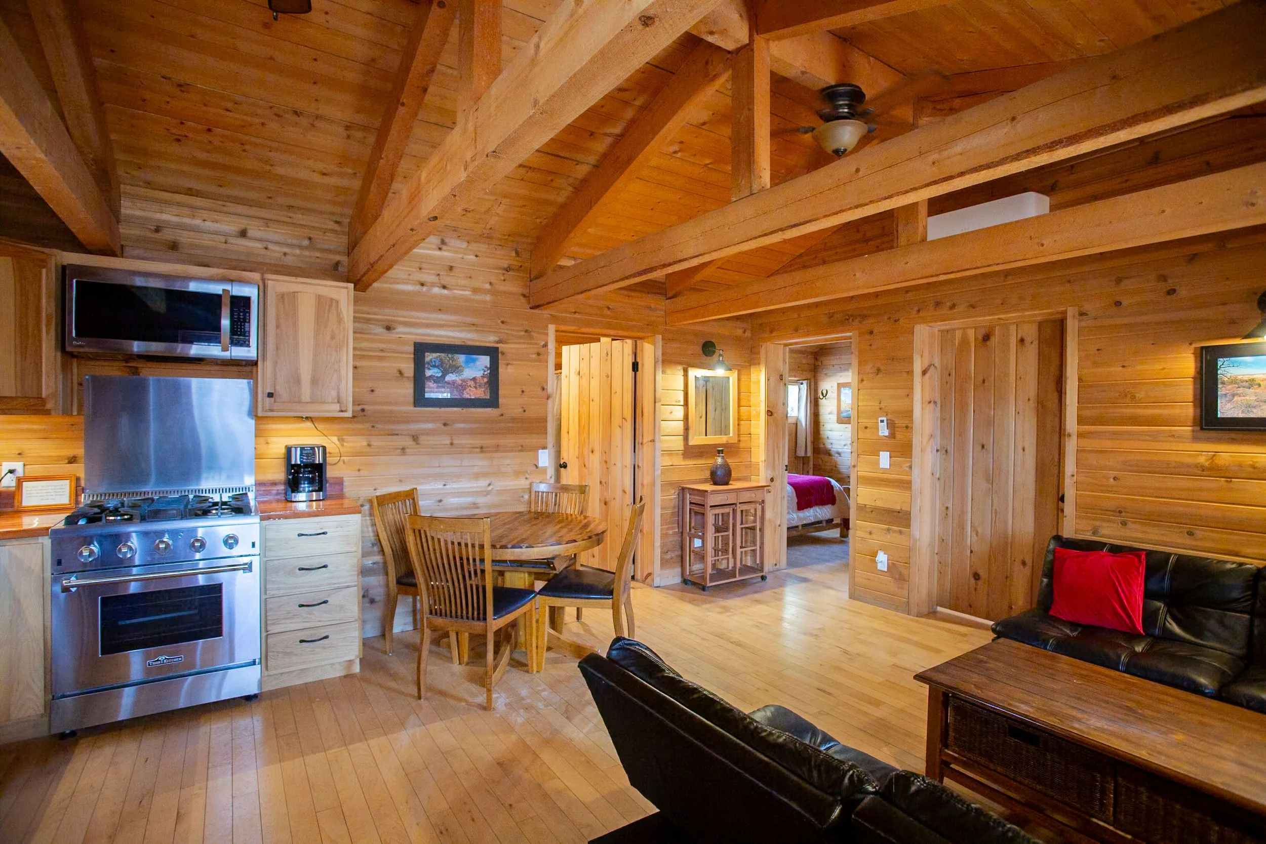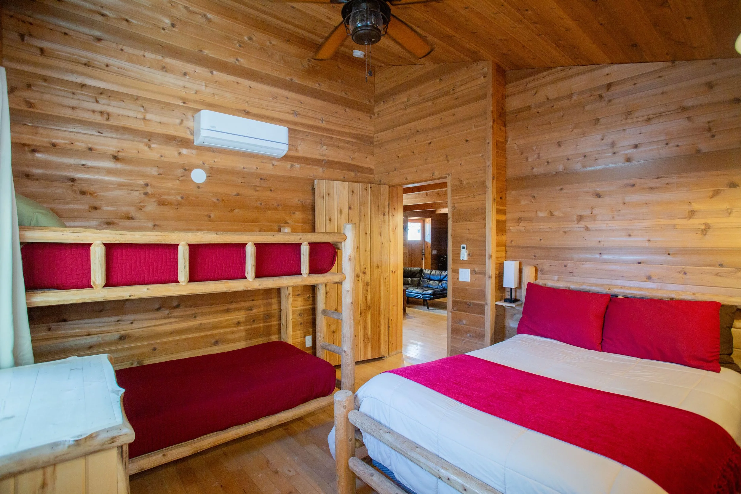 ADA Accessible unit featuring two private bedrooms: one with a queen bed, and the other with a full bed plus a twin bunk set. Includes a fully equipped kitchen with 4-burner stove, prep counter, refrigerator, microwave, coffee maker, sink, cookware, and tableware. Dining area, spacious living room with two full-sized fold-down couches, temperature-control system, private bathroom, and a deck with a charcoal grill.