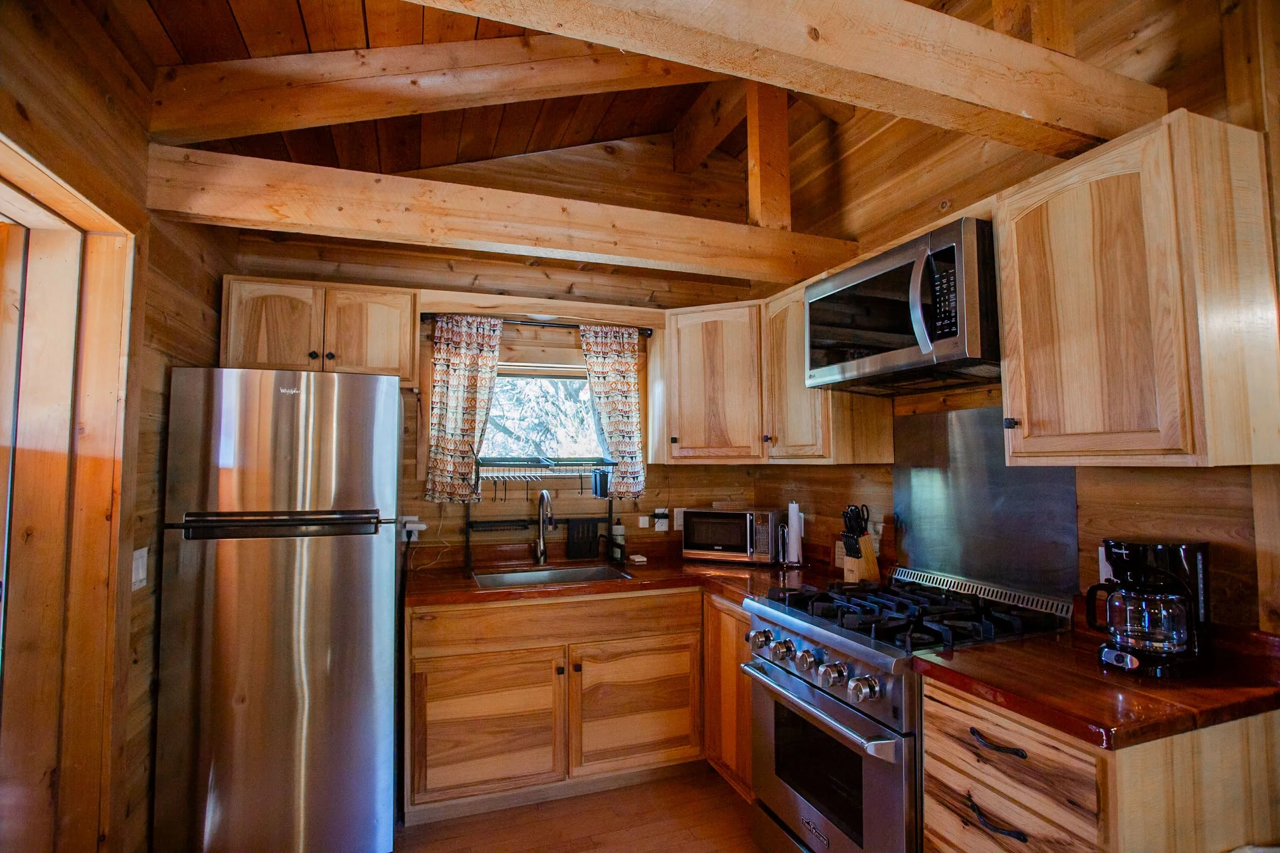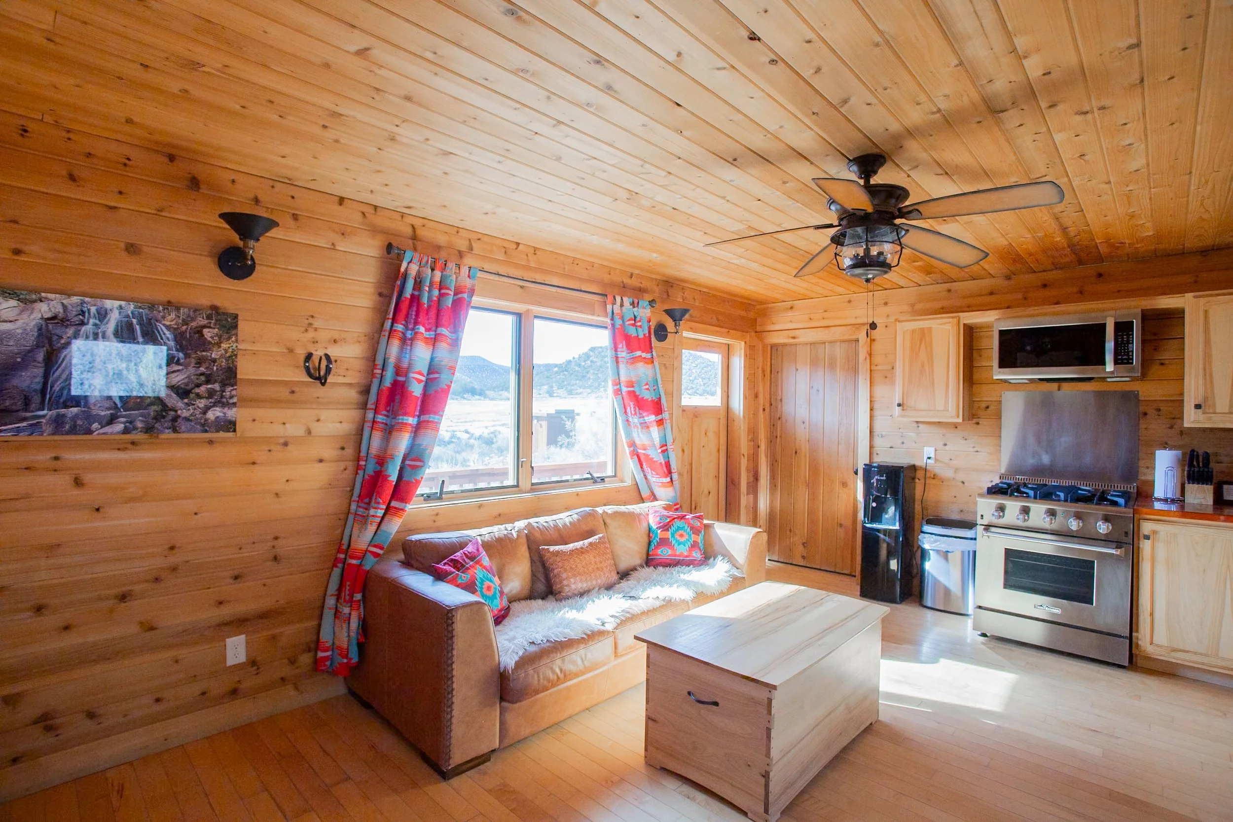 Features two private queen bedrooms and a full kitchen with 4-burner stove, prep counter, refrigerator, microwave, coffee maker, sink, cookware, and tableware. Includes a dining area, spacious living room with fold-down couch, temperature-control system, private bathroom, and a deck with charcoal grill.