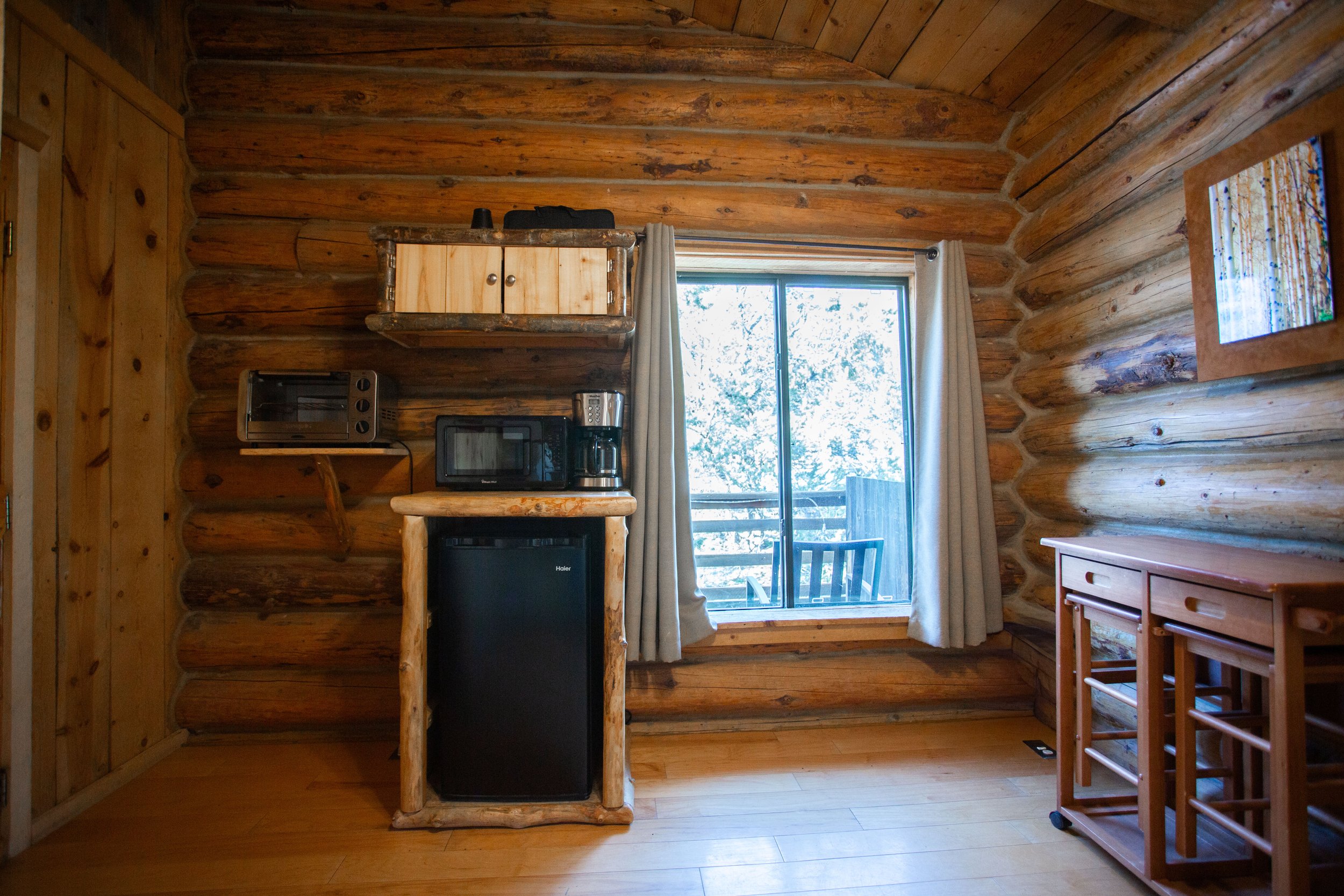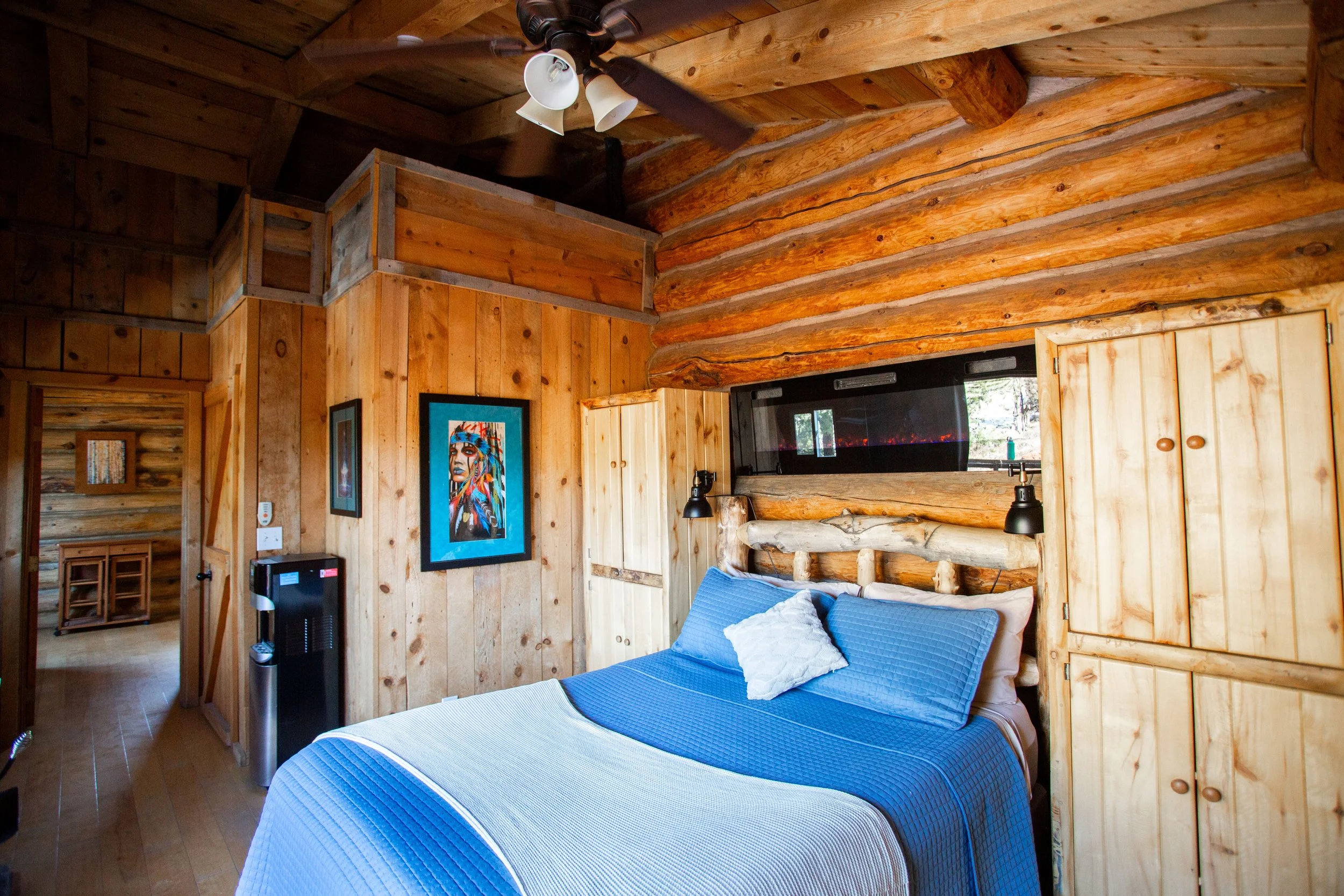 Queen bed in the main room with private en-suite bathroom and deck. The main room features evaporative cooling, a floor space heater, and a wood-burning fireplace. An adjacent sitting room includes a window air-conditioning unit. Additional amenities include a mini fridge, coffee maker, toaster oven, and hot/cold water dispenser.
